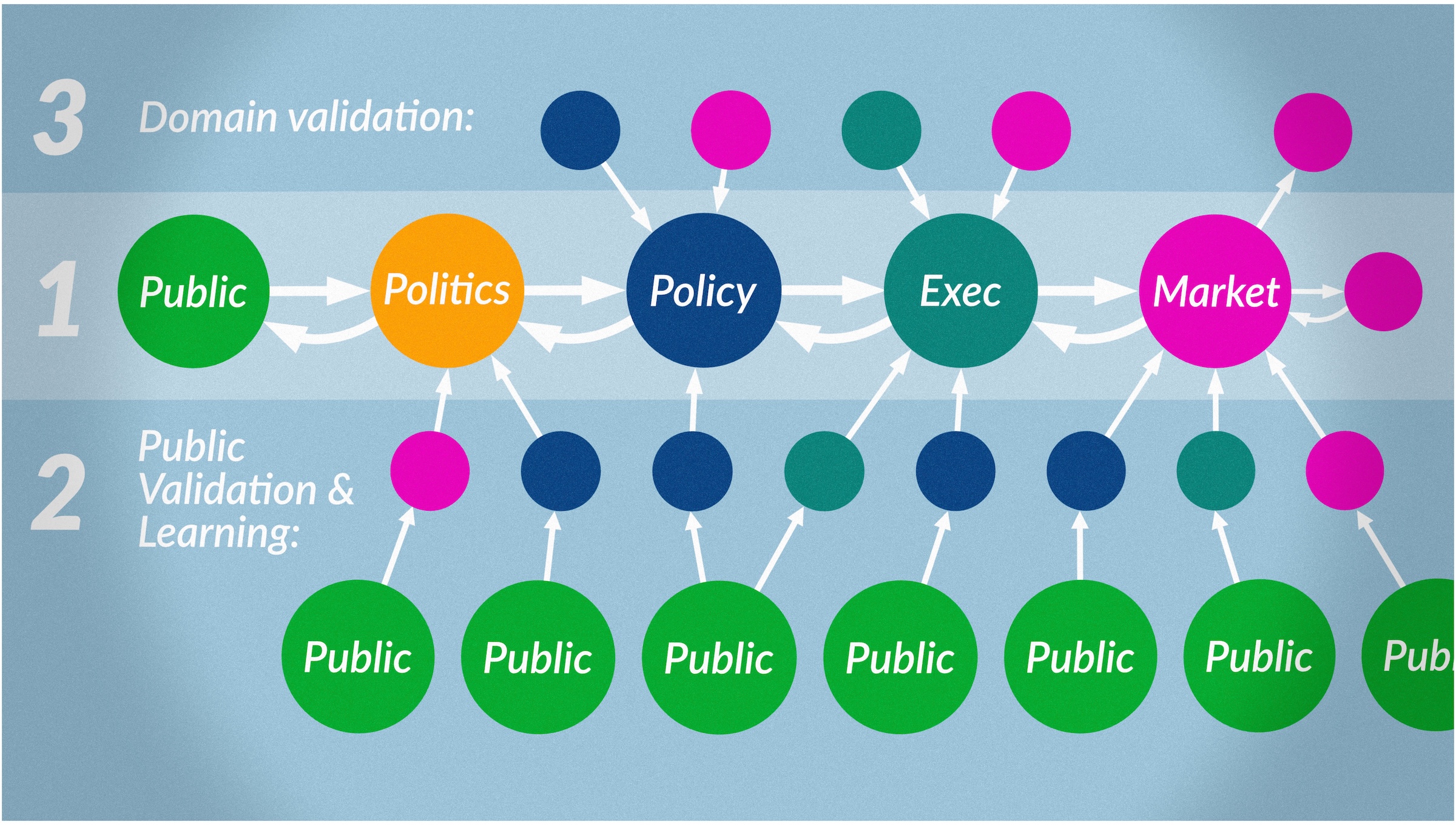 So, let’s say some policy has been formed to start a change in the executive branch, to better support some people. That would be a moment where both Policy AND Exec call upon the Public to validate said intervention, or change. Easy as that.